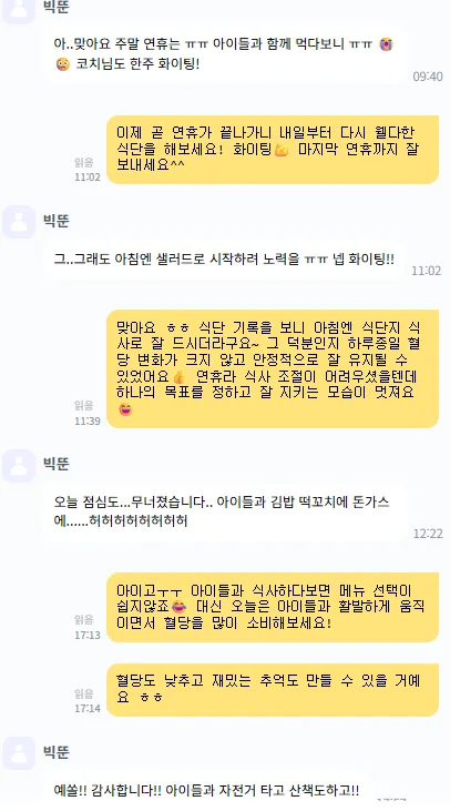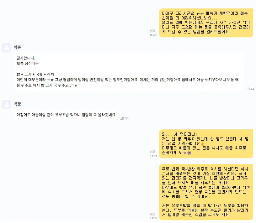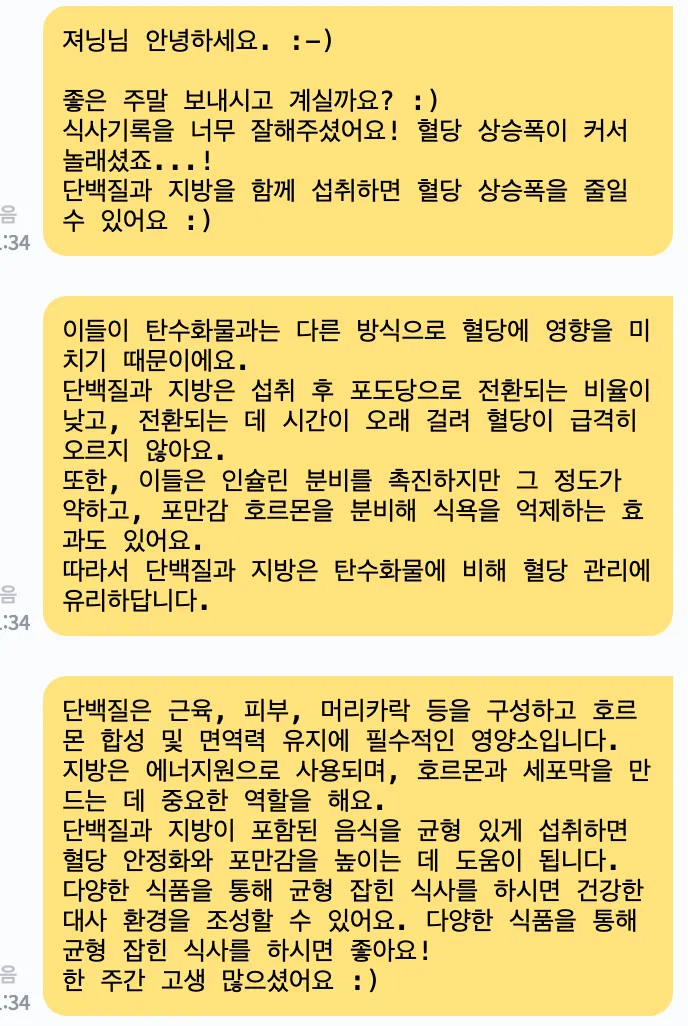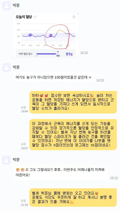 특히, 구독자님이 좌절하지 않도록 따뜻하게 격려하고 응원해주셨는데요. 운동으로 인해 발생할 수 있는 혈당 스파이크 현상에 대해 친절하게 설명해드리고, 이후 근육의 혈당 소비 능력이 향상되었다는 긍정적인 변화도 함께 인지시켜주시는 모습이 인상적이었습니다.