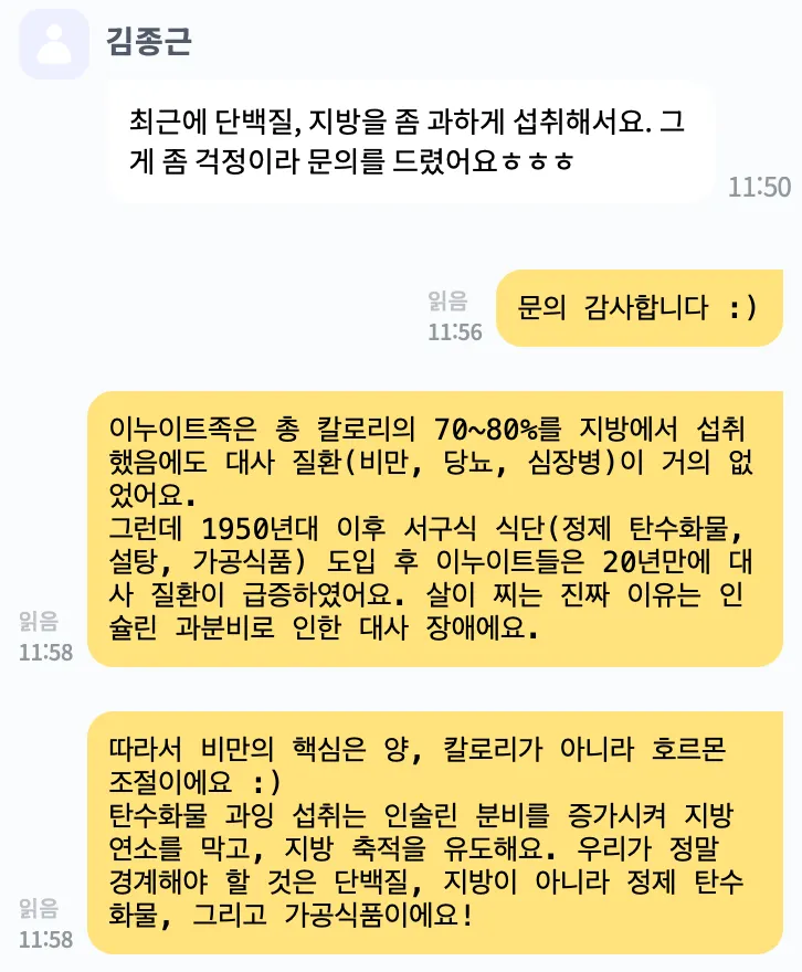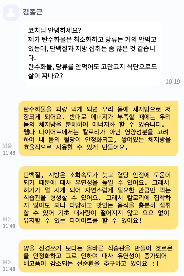 이유수 | 김종근 | 이유수 코치님은 김종근님의 질문에 항상 적극적으로 답변해 주시며 구독자님을 식단지 식사 행동 변화로 이끌었습니다.