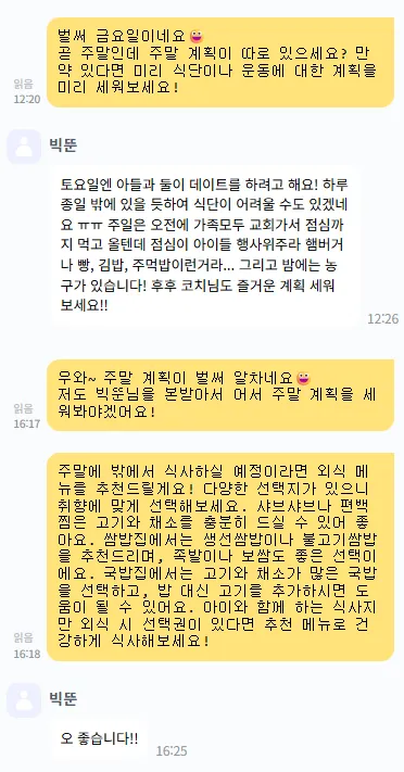특히 식단지 식사와 관련한 자세한 코칭으로, 삶은 계란과 토마토 등으로 건강한 첫 끼를 실천하려는 노력을 구독자님으로부터 자연스럽게 이끌어내주셨습니다.