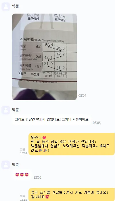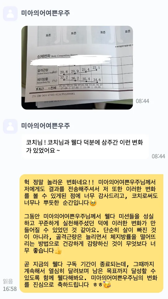그 결과, 구독자님은 꾸준히 운동을 실천해주셨을 뿐만 아니라, 웰다 참여 이후 개선된 인바디 검사 결과를 직접 공유하며 코치님께 감사를 전할 만큼 좋은 관계를 형성하셨습니다.