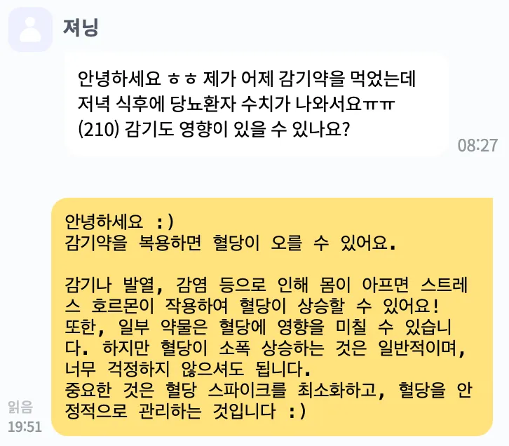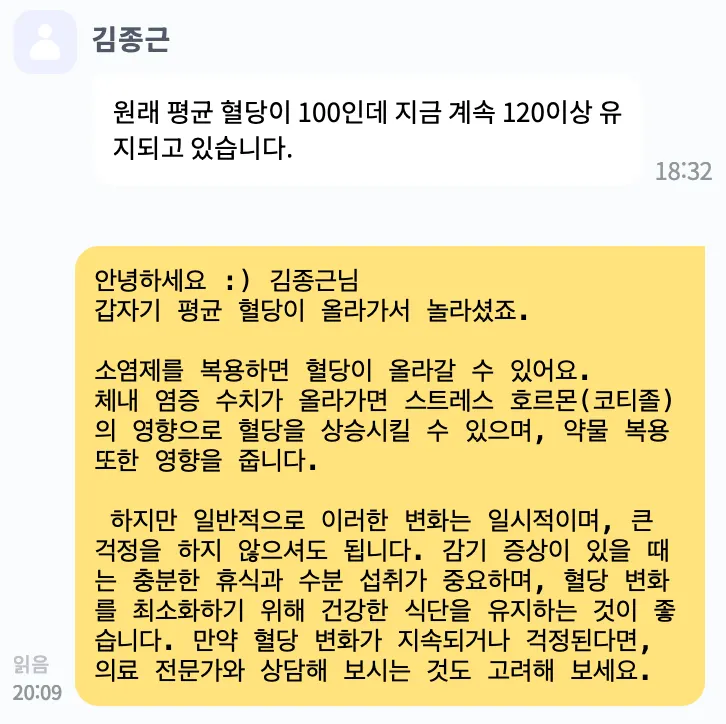 또한, 혈당에 대한 걱정이 크셨던 구독자님께 이해하기 쉽고 친절한 답변을 통해 걱정과 불안을 덜어드리며 심리적인 안정을 도와주셨습니다.