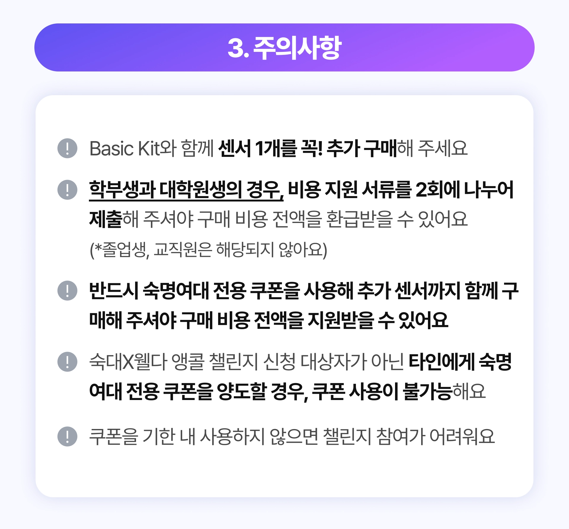 ※ 반드시 숙명여대 전용 쿠폰을 사용해 추가 센서까지 함께 구매해 주셔야 구매 비용 전액을 지원받을 수 있어요